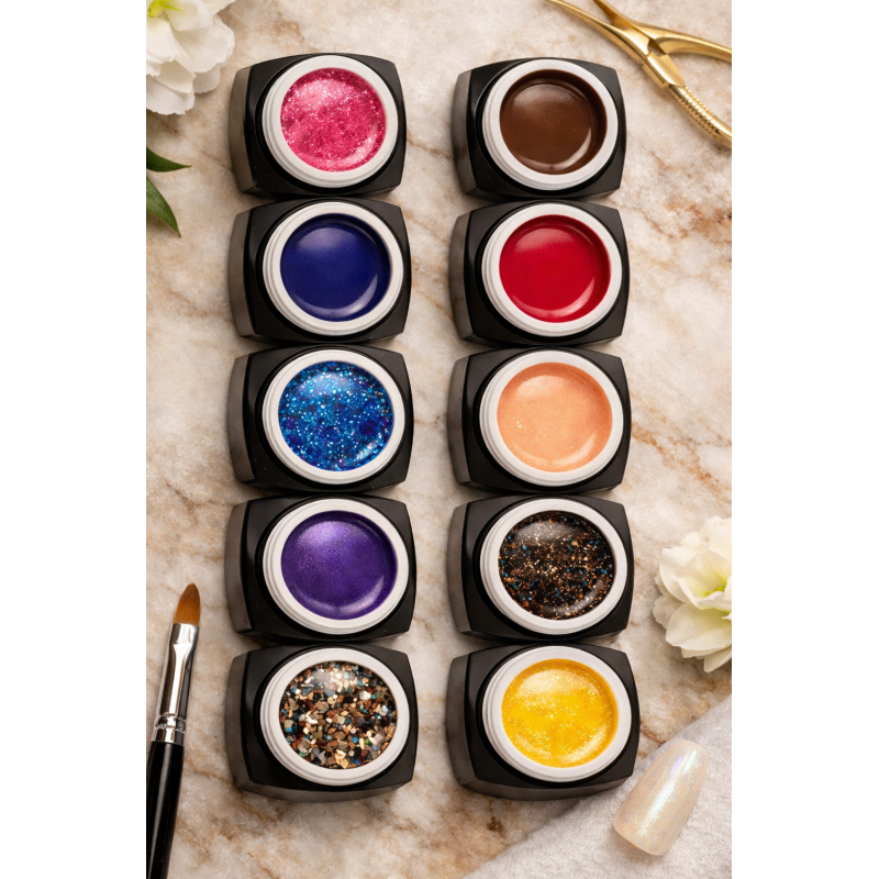 Palette de 10 gels UV professionnels aux reflets nacrés, idéale pour créer des poses lumineuses, élégantes et à forte valeur perçue en salon.
